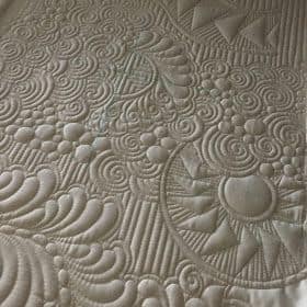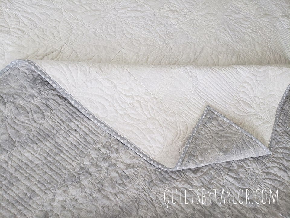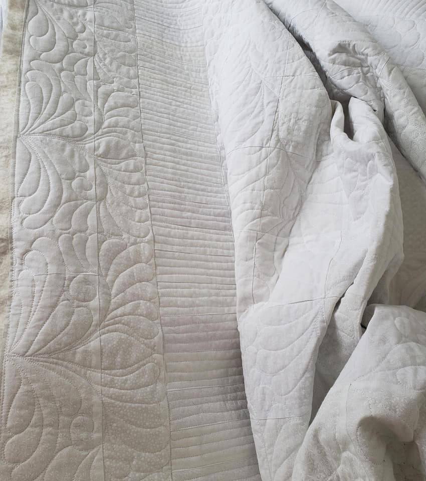 What makes this quilt truly special is the custom quilting that transforms a simple piece of fabric into a work of art. Featuring elegant motifs such as swirling feathers, delicate vines, and intricate geometric patterns, the quilting itself becomes the design, adding depth and movement to an otherwise minimalist canvas.