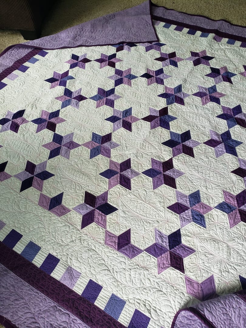 This finished Quilt for Sale Tulip Trails quilt is a true beauty, full of charm and handmade detail. The quilt is crafted in several shades of purple against a cream backdrop, making it both vibrant and soothing. Measuring 84″ x 96″, it’s sized perfectly for a Queen bed, but also works as a generous layer on a King.
